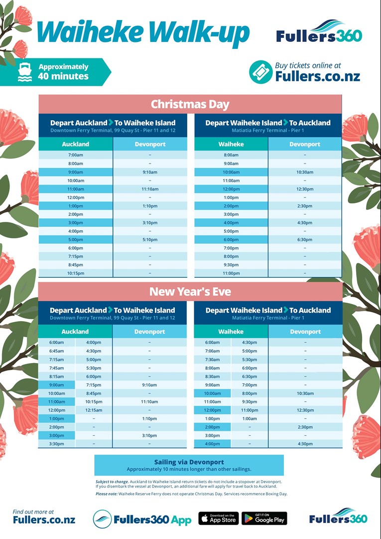 On New Years Eve, we have catered for an extra post-midnight service both to Waiheke and off island to Auckland, please ensure you pre-plan your travel and accommodation arrangements as these services will be busy over the New Year travel period