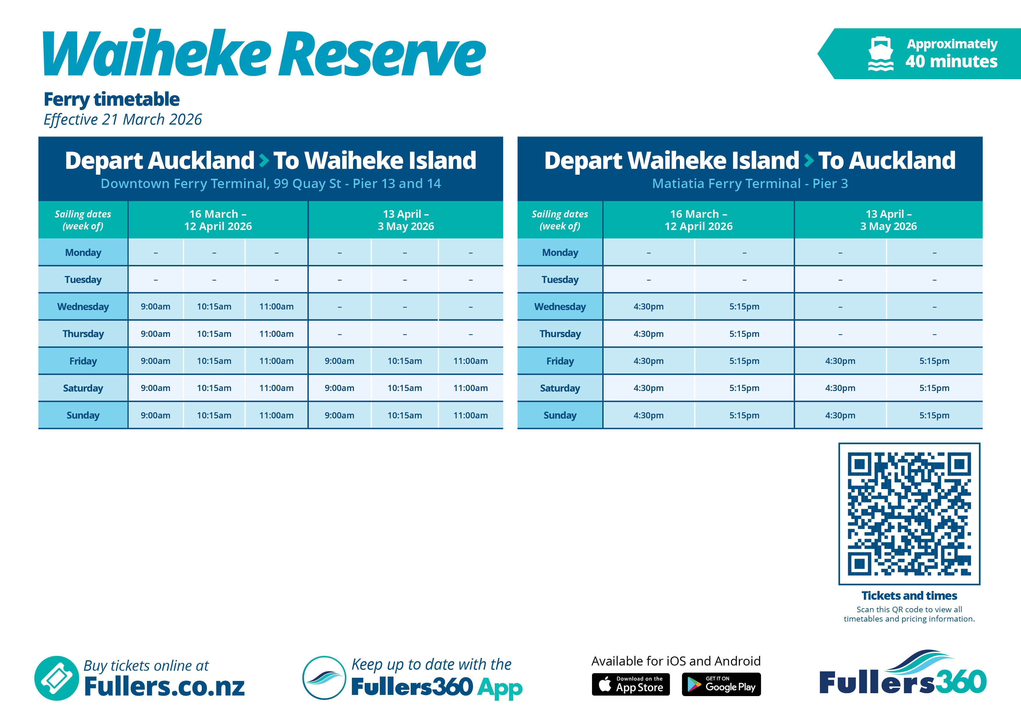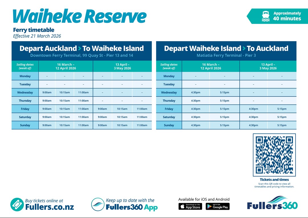 The Waiheke Reserve ferry is a seasonal ferry service to Waiheke Island operating from October to April. The Waiheke Reserve service lets visitors pre-book the date and departure times before travel to and from Waiheke Island.