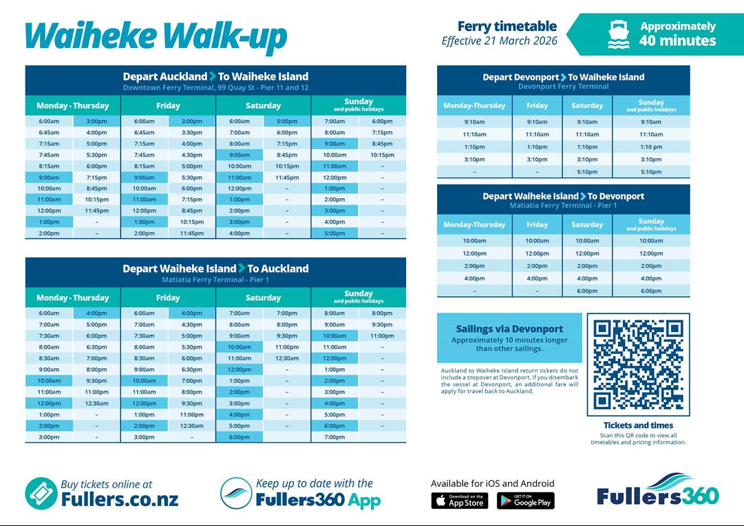 From Saturday 21 March, we switch to our off-peak timetable. Some Waiheke Walk-up sailings will change. Please check the latest timetable before travelling.